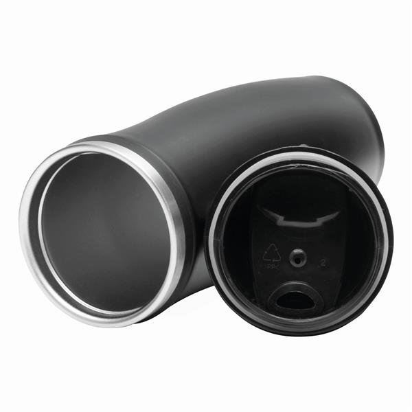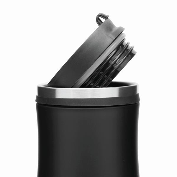 Kubek termiczny o podwójnych ściankach DARK CREMA. Wewnątrz i na zewnątrz stal nierdzewna. Odkręcana plastikowa pokrywa z wbudowanym, składanym otworem do picia, kolorowy gumowy pierścień wokół otworu i gumowany spód dla lepszej przyczepności, pojemność ok. 400 ml.