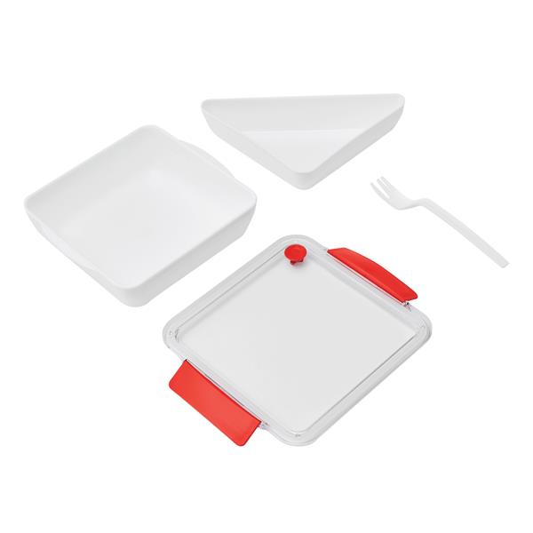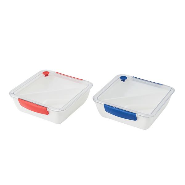 Pojemnik na lunch DELICIOUS z wydzieloną przegrodą (ok. 400 ml), plastikowym widelcem w zestawie. Całkowita pojemność ok. 1000 ml, posiada wywietrznik w pokrywie. Pojemnik można myć w zmywarce i używać w kuchence mikrofalowej.