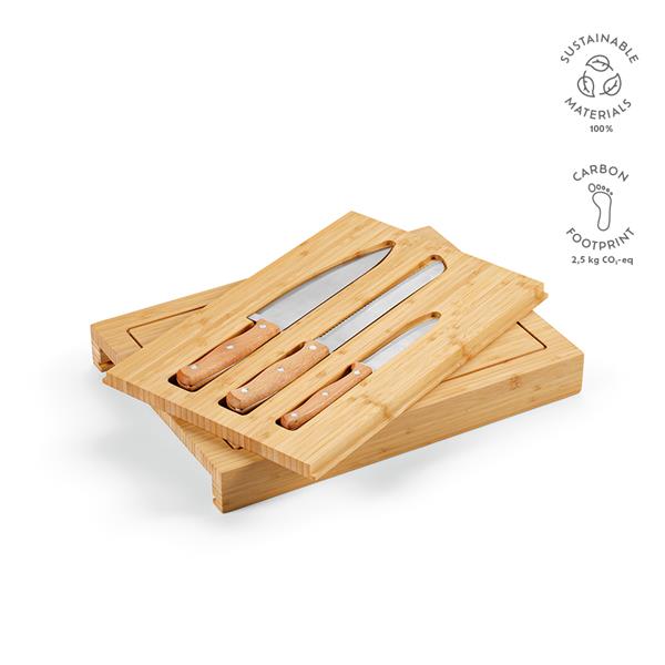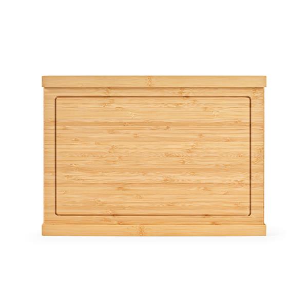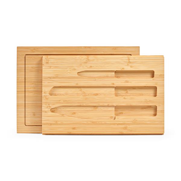 To wyjątkowa bambusowa deska. Ma wymiary 28 x 39 x 4,5 cm i rowek na obwodzie, dzięki czemu kryje w sobie sekret – wysuwaną tackę z trzema nożami kuchennymi. Dostarczana w indywidualnym kartonowym pudełku z recyklingu.