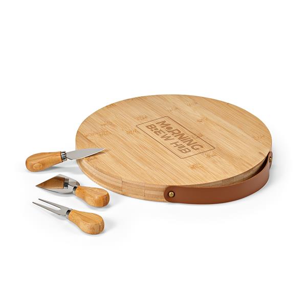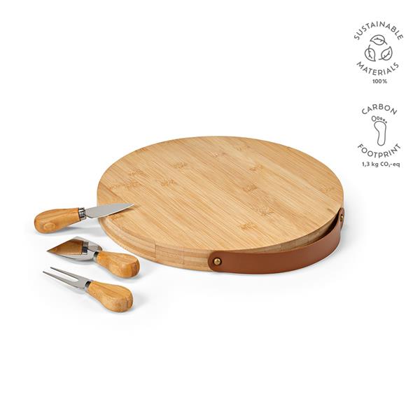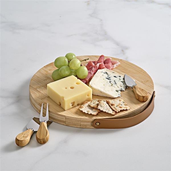 W świecie kulinarnych rozkoszy przedstawiamy tę bambusową deskę. Ma ona średnicę 30 cm i grubość 2,6 cm oraz uchwyt. W komplecie znajdują się trzy sztućce ze stali nierdzewnej.