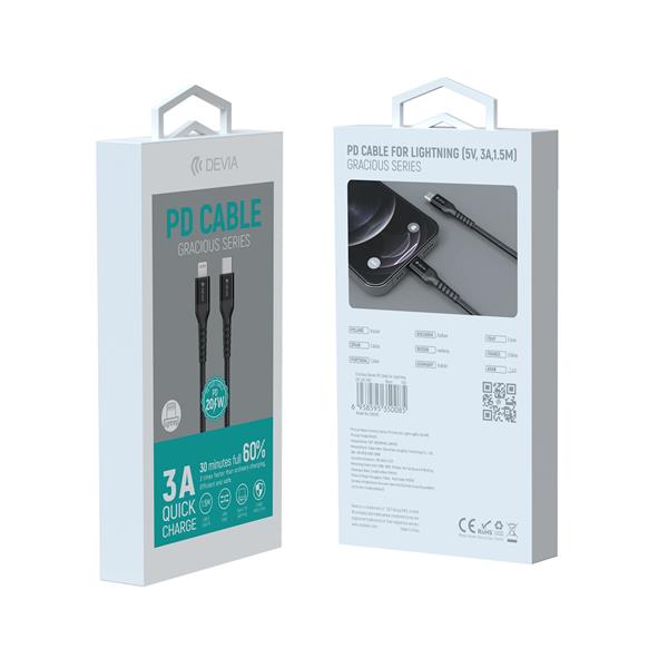 Devia Gracious PD to kabel wyposażony w złącza USB-C i Lightning. Kabel został zaprojektowany tak aby zapewnić jak największy komfort dla codziennego użytkowania. Kabel pozwoli w pełni wykorzystać maksymalną moc z jaką mogą ładować się urządzenia kompatybilne. Wykonany z elastycznego silikonu w nylonowym oplocie zapewni długą żywotność.