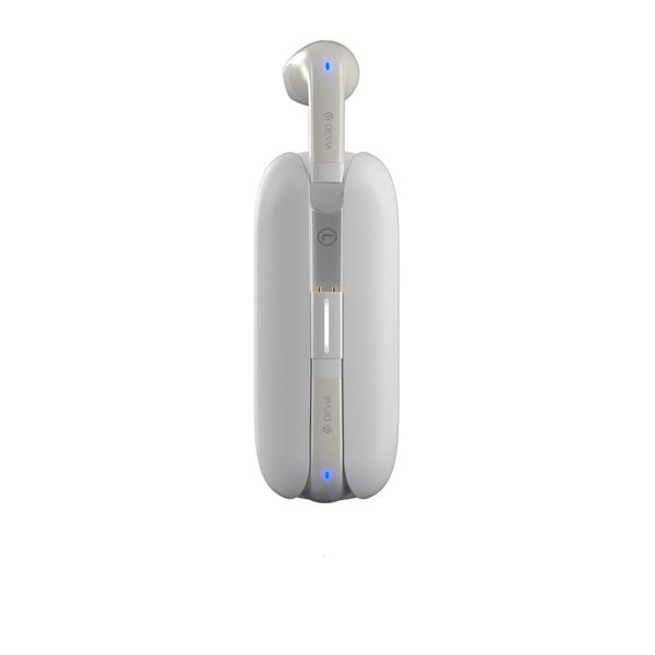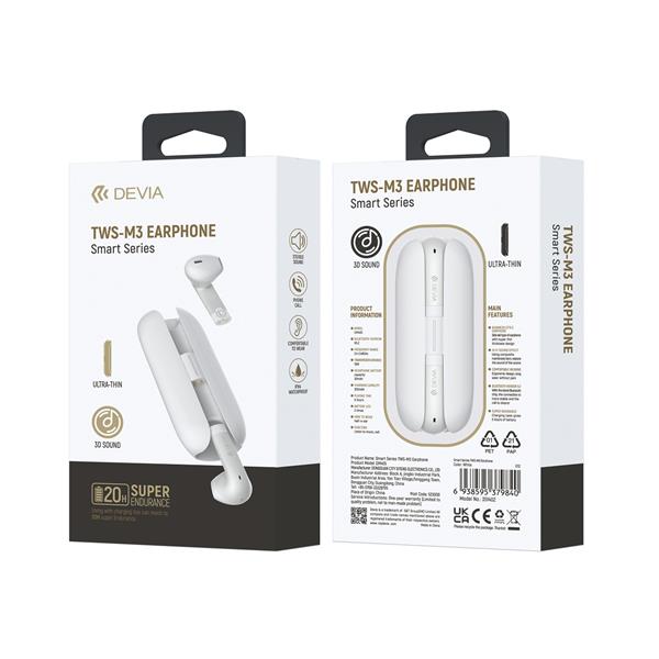 Devia Smart M3 to douszne słuchawki bluetooth 5.2 TWS z pudełkiem ładującym. Słuchawki wspierają technologię TWS (True Wireless Stereo) – obie słuchawki łączą się ze sobą tworząc bezprzewodowy zestaw stereo. Przenośne pudełko z wbudowaną baterią oprócz funkcji ładowania pozwala bezpiecznie przechowywać słuchawki w kieszeni, torbie lub plecaku. Uwolnij swoje ręce i słuchaj muzyki, radia internetowego, podczas pracy, spaceru, treningu czy prowadzenia samochodu. Słuchawki Devia Smart M3 TWS są idealnym rozwiązaniem dla użytkowników smartfonów, komputerów, notebooków, tabletów i innych urządzeń obsługujących technologię Bluetooth. Są kompatybilne z większością urządzeń z systemem Android oraz iOS. Słuchawki posiadają także mikrofon, dzięki czemu bez problemu możesz prowadzić rozmowy głosowe. Czas trwania rozmów/ słuchania muzyki na pełnym naładowaniu wynosi około 300 minut (w zależności od poziomu głośności), dzięki wykorzystaniu energooszczędnej technologii Bluetooth 5.2.