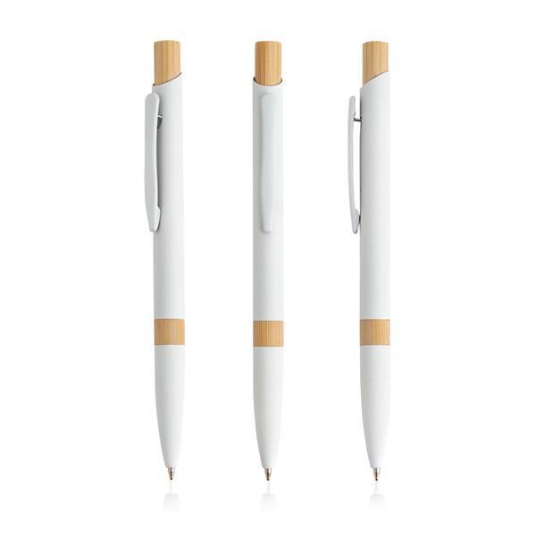 Długopis aluminiowy z bambusowymi detalami. Ten długopis piszący na niebiesko ma nowoczesny design, łączący metal z naturalnym bambusem, tworząc niezapomniany prezent. Rozmiar: 0 x 0 x 14 cm L1 (grawer laserowy): 4 x 0,6 Kolor: Biały