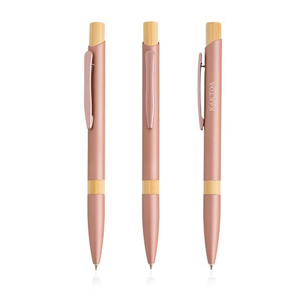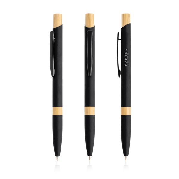 Długopis aluminiowy z bambusowymi detalami. Ten długopis piszący na niebiesko ma nowoczesny design, łączący metal z naturalnym bambusem, tworząc niezapomniany prezent.