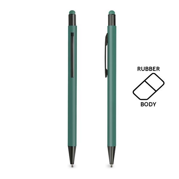 Długopis aluminiowy z gumką do obsługi ekranów dotykowych i gumowaną powierzchnią, z mechanizmem wciskanym, pisze na niebiesko. Rozmiar: 13,5 x 0,8 cm L1 (grawer laserowy): 5 x 0,6 cm DC0 (długopisy, zapalniczki): 5 x 0,5 cm Kolor: Ciemno zielony