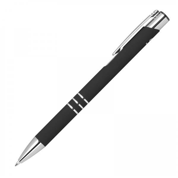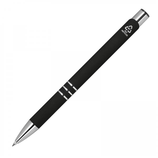 Długopis wykonany z aluminium z recyklingu z przyjemną w dotyku, gumową powierzchnią i półżelowym niebieskim wkładem.