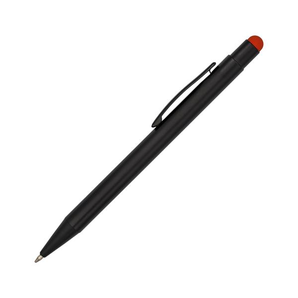 Długopis z czarnym korpusem i kolorową końcówką do ekranów dotykowych. Możliwość wykonana błyszczącego logo w kolorze nawiązującym do koloru końcówki. Niebieski wkład.