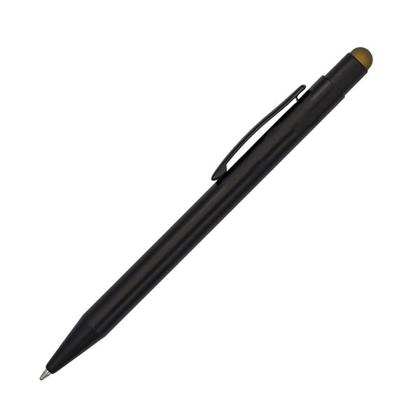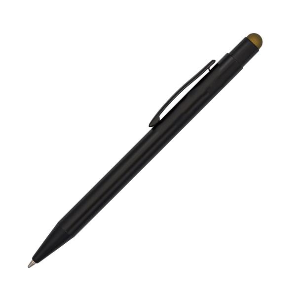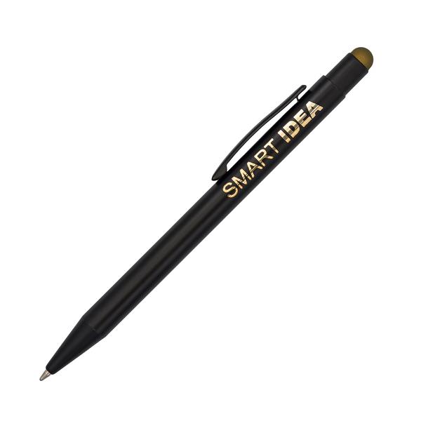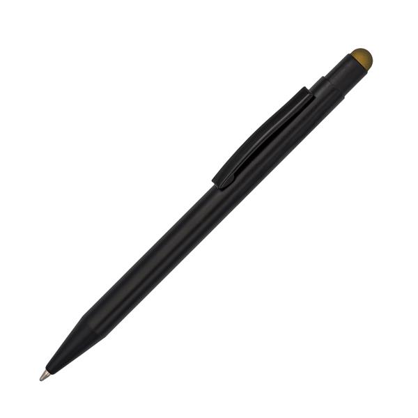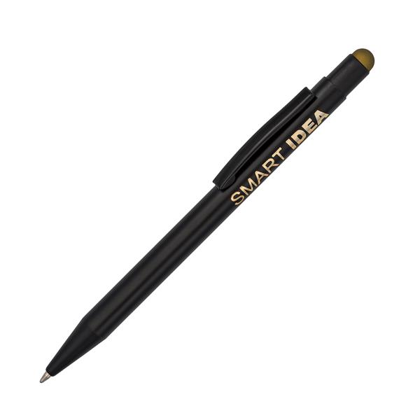 Długopis z czarnym korpusem i kolorową końcówką do ekranów dotykowych. Możliwość wykonana błyszczącego logo w kolorze nawiązującym do koloru końcówki. Niebieski wkład.