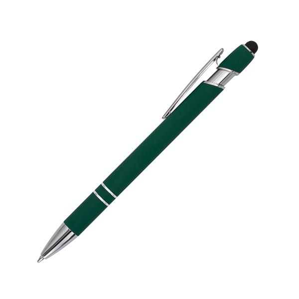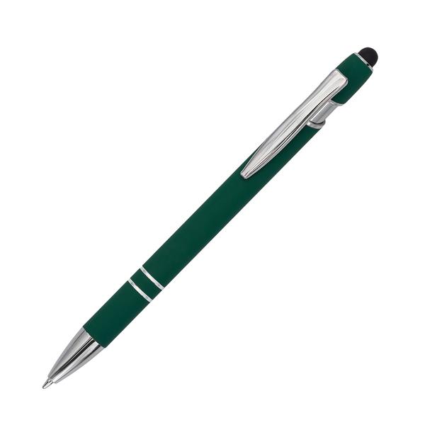 Aluminiowy długopis o przyjemnym w dotyku, satynowym wykończeniu ze srebrnymi elementami. Wyposażony w końcówkę do ekranów dotykowych. Niebieski wkład.