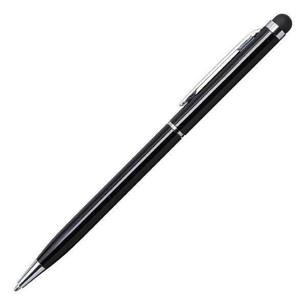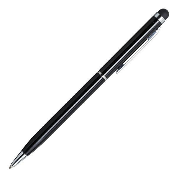 Długopis z końcówką przystosowaną do ekranów dotykowych. Korpus wykonany z aluminium, skuwka z metalu. Wkład w kolorze niebieskim. Posiada obrotowy mechanizm włączania.