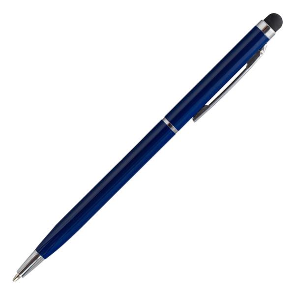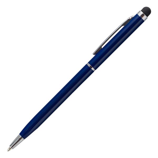 Długopis z końcówką przystosowaną do ekranów dotykowych. Korpus wykonany z aluminium, skuwka z metalu. Wkład w kolorze niebieskim. Posiada obrotowy mechanizm włączania.