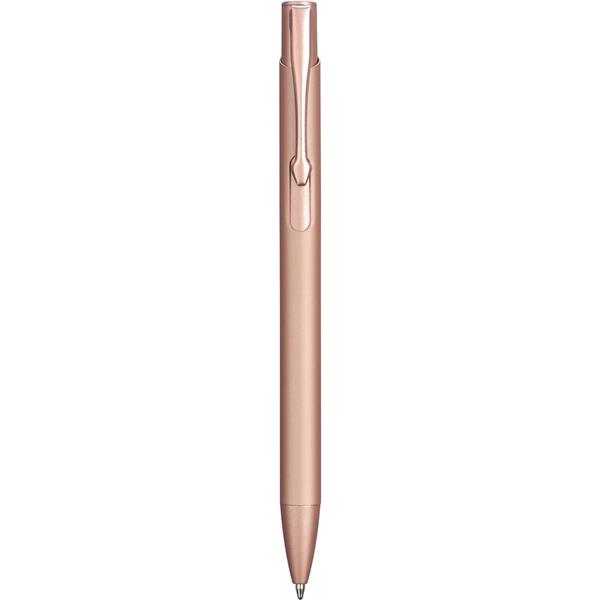 Długopis aluminiowy z recyklingu z gumowaną powłoką na korpusie, ikona aluminium z recyklingu wygrawerowana na produkcie, wkład w niebieskim kolorze, produkt wykonany z aluminium i ABS