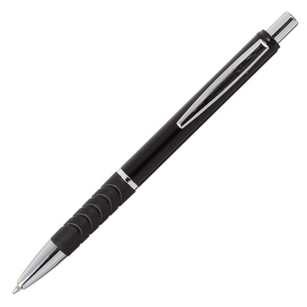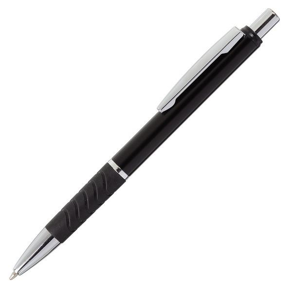 Promocyjny aluminiowy długopis z gumką, metalową skuwką, przyciskiem i końcówką. Wyposażony w niebieski wkład.