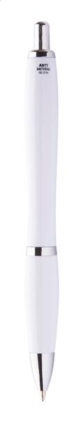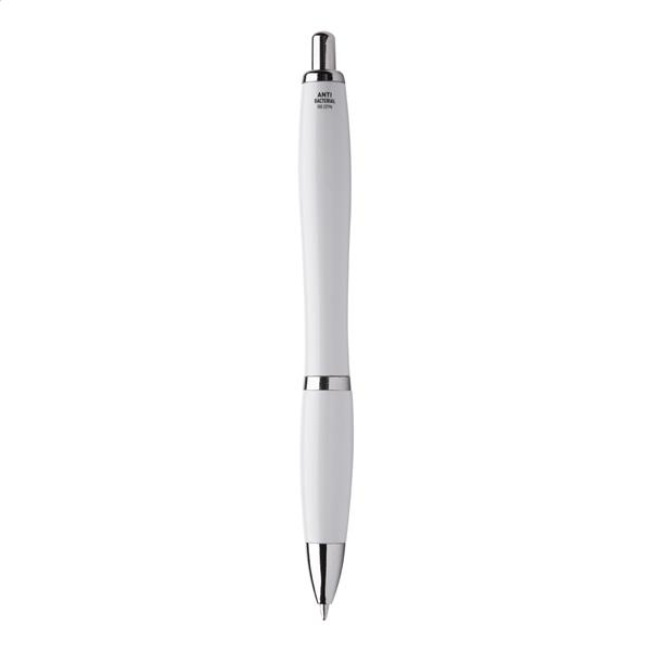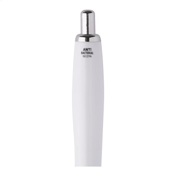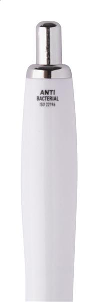 Plastikowy długopis z antybakteryjnym korpusem i chromowanymi elementami. Zawiera dodatek nanosrebra zapobiegający rozwojowi bakterii na powierzchni długopisu. Z mechanizmem przyciskowym i niebieskim wkładem. Produkt zgodny z ISO 22196: 2011.