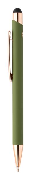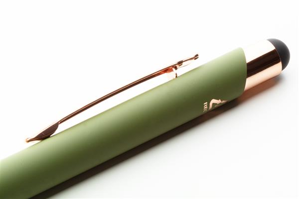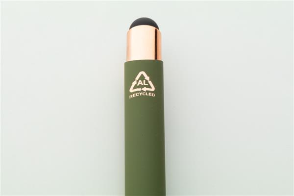 Długopis z aluminium pochodzącego z recyklingu i końcówką do ekranów dotykowych z gumowanym wykończeniem i elementami w kolorze różowego złota. Ze specjalną powłoką pod grawer lustrzany w kolorze różowego złota. Niebieski wkład.