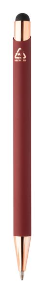 Długopis z aluminium pochodzącego z recyklingu i końcówką do ekranów dotykowych z gumowanym wykończeniem i elementami w kolorze różowego złota. Ze specjalną powłoką pod grawer lustrzany w kolorze różowego złota. Niebieski wkład.