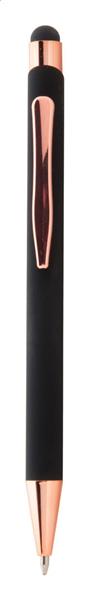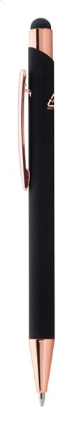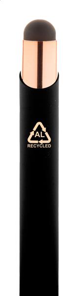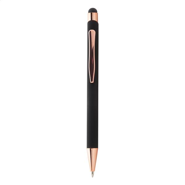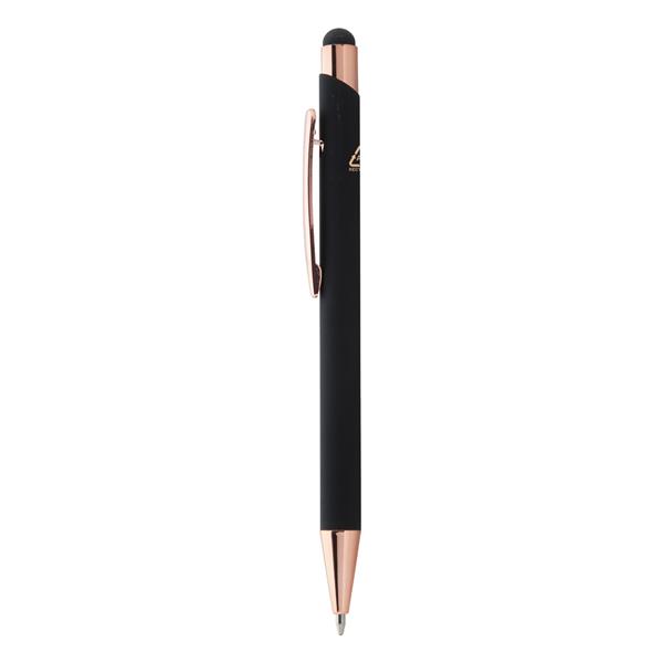 Długopis z aluminium pochodzącego z recyklingu i końcówką do ekranów dotykowych z gumowanym wykończeniem i elementami w kolorze różowego złota. Ze specjalną powłoką pod grawer lustrzany w kolorze różowego złota. Niebieski wkład.