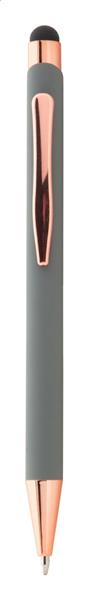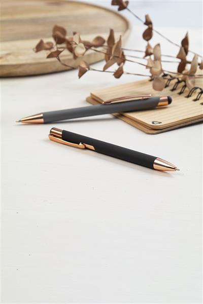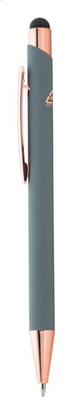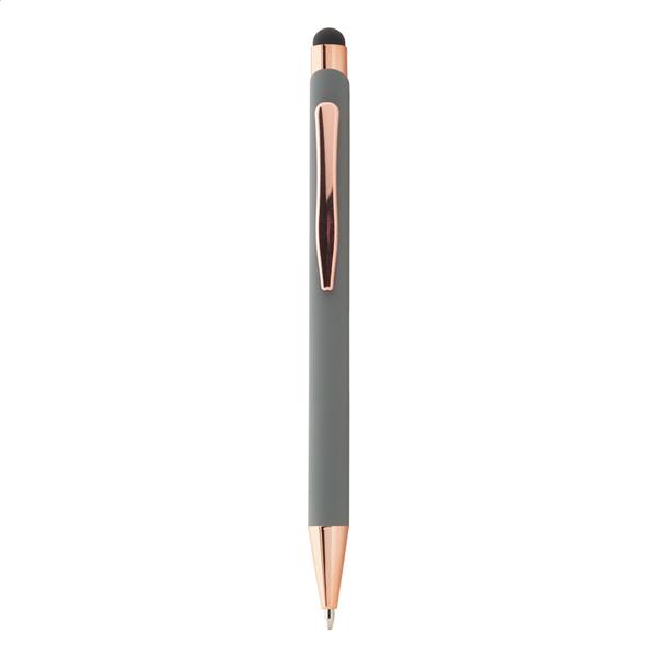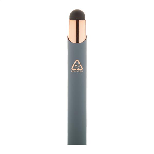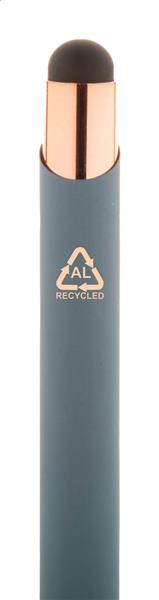 Długopis z aluminium pochodzącego z recyklingu i końcówką do ekranów dotykowych z gumowanym wykończeniem i elementami w kolorze różowego złota. Ze specjalną powłoką pod grawer lustrzany w kolorze różowego złota. Niebieski wkład.