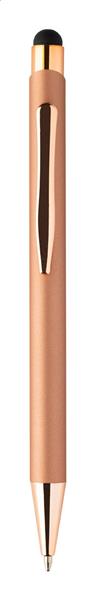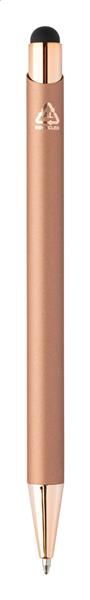 Długopis z aluminium pochodzącego z recyklingu i końcówką do ekranów dotykowych z gumowanym wykończeniem i elementami w kolorze różowego złota. Ze specjalną powłoką pod grawer lustrzany w kolorze różowego złota. Niebieski wkład.