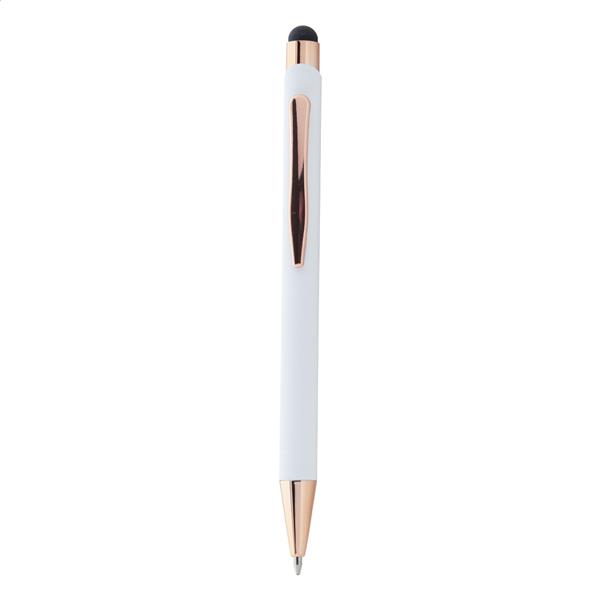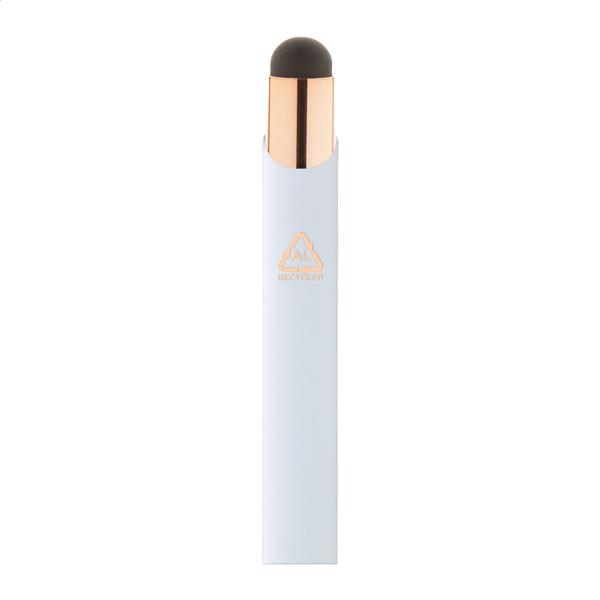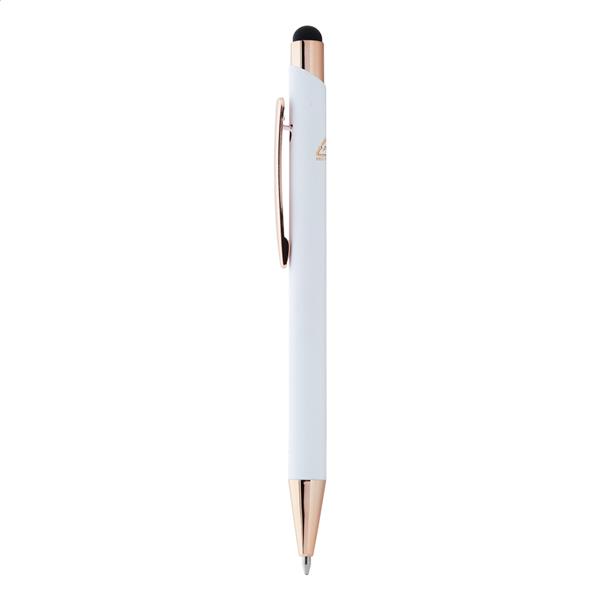 Długopis z aluminium pochodzącego z recyklingu i końcówką do ekranów dotykowych z gumowanym wykończeniem i elementami w kolorze różowego złota. Ze specjalną powłoką pod grawer lustrzany w kolorze różowego złota. Niebieski wkład.