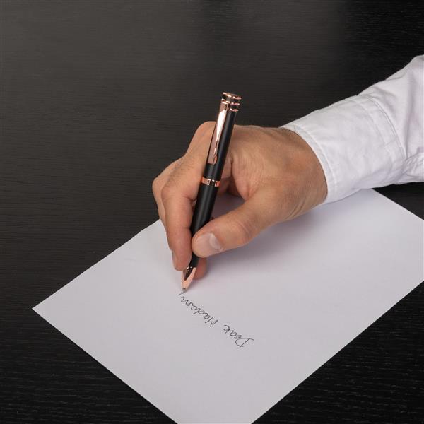 Pióro `Austin` jest zbudowane na jednej z najbardziej ikonicznych sylwetek Cerruti: pierścieniowej górze. W tej nowej wersji, bawimy się z matowym korpusem ozdobionym pięknymi platerowanymi metalowymi wykończeniami. Ta wersja w kolorze czarnym i różanego złota jest ponadczasowo elegancka.