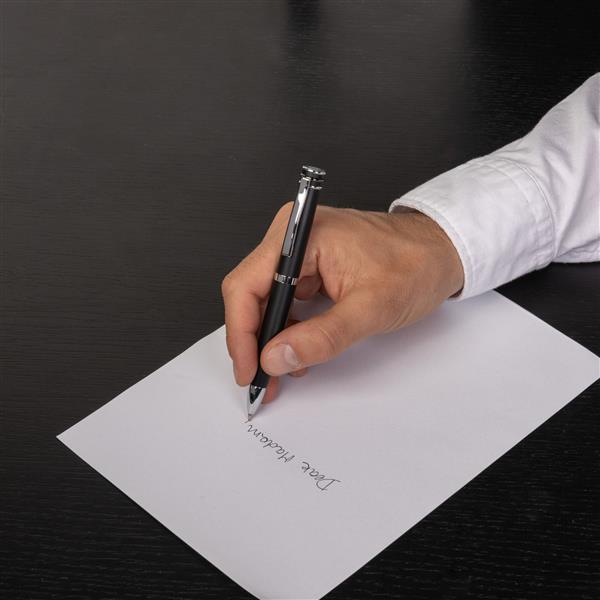 Długopis Austin posiada matowy korpus oraz chromowane srebrne dodatki. Rozmiar: Dia. 12 / h. 135 mm Kolor: Czarny