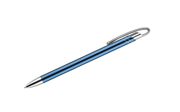 Cienki i zgrabny metalowy długopis w kolorze o metalicznym wykończeniu. Klip i końcówki w kolorze srebrnym chromowanym. AVALO wyróżnia się wśród podobnych długopisów oryginalnym projektem klipu. Korpus ozdobiony został dwoma skośnymi paskami w kolorze srebrnym. Wkład o grubości 0,7 mm w kolorze niebieskim.