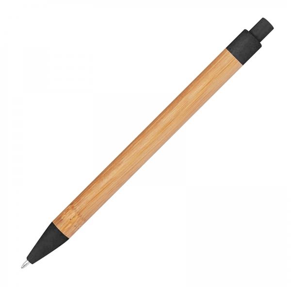 Długopis wykonany z bambusa z kolorowymi elementami wykonanymi z włókna pszenicznego. Posiada klikany mechanizm i wkład w kolorze niebieskim.