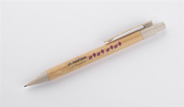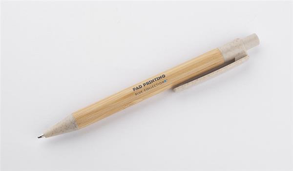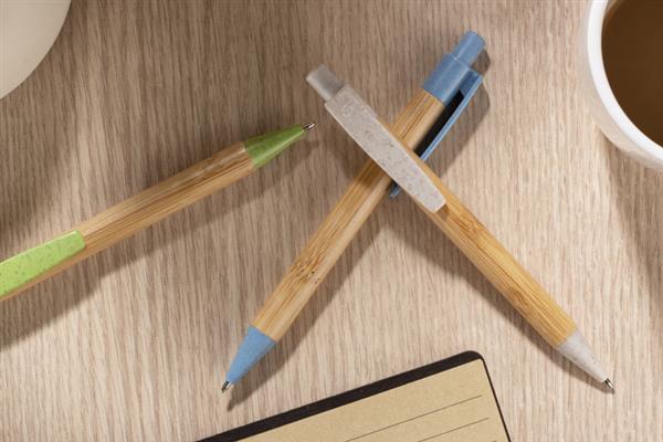 BAMMO to klasyczny długopis wykonany z materiałów przyjaznych środowisku. Bambusowy korpus połączony został z wykończeniami z tworzywa wykonanego w 50% ze słomy. Długopis automatyczny, wkład w kolorze niebieskim.