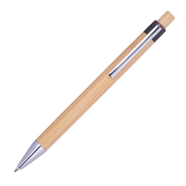 Długopis wykonany z bambusa z chromowanymi akcenatami i niebieskim wkładem.