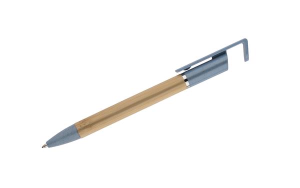 Długopis FONIK z bambusowym korpusem oraz klipem wykonanym ze słomy pszennej to praktyczny gadżet pełniący także funkcję stojaka na telefon.