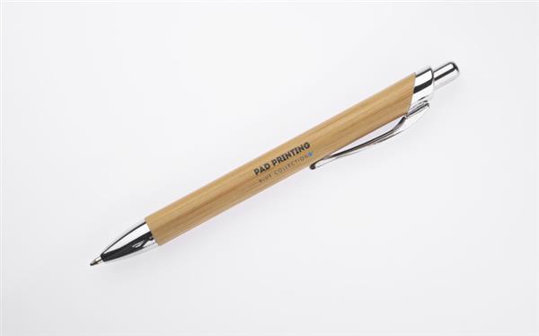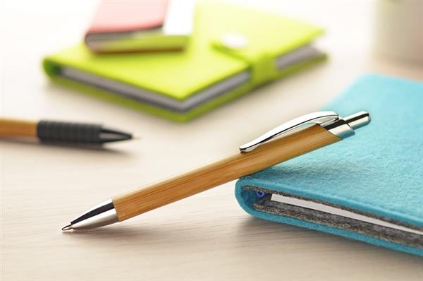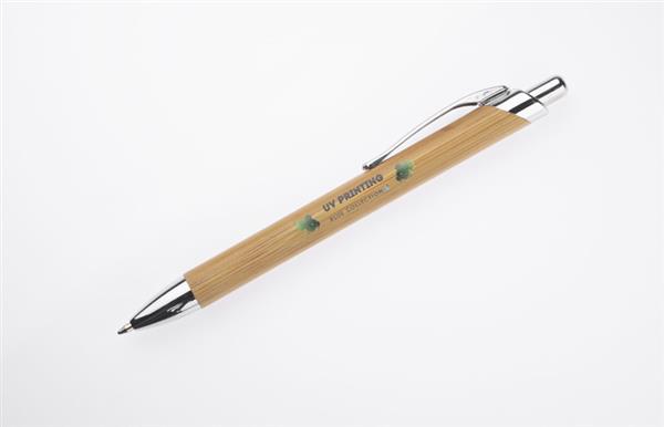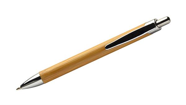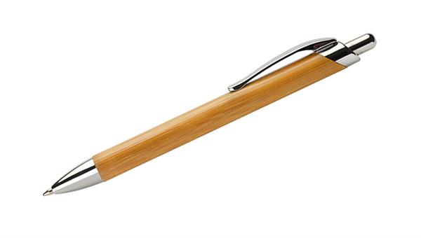 Stylowy długopis z bambusowym korpusem. Niezwykle przyjemna w dotyku faktura drewna z pewnością zwróci uwagę każdego klienta. Długopis jest wykończony metalowymi elementami w kolorze srebrnym. Znakowanie możliwe na bambusowym korpusie.