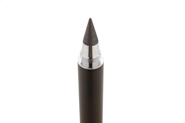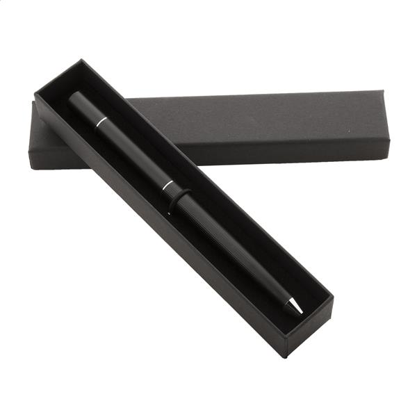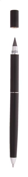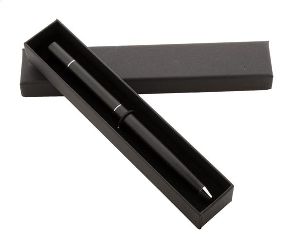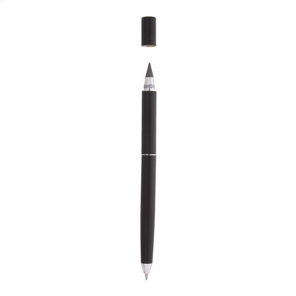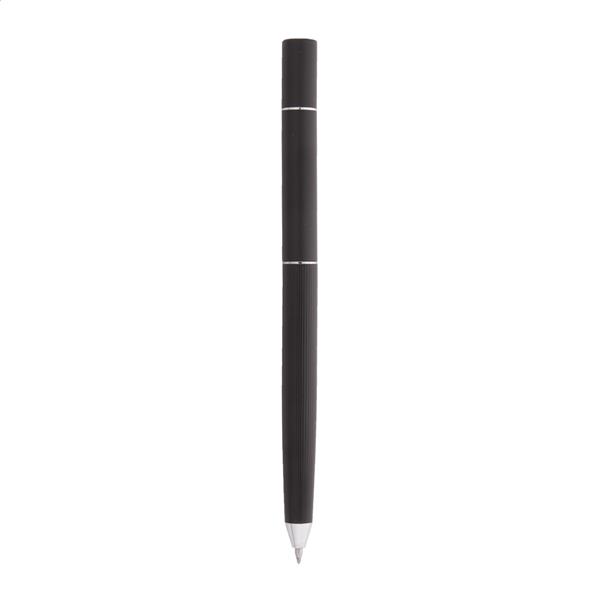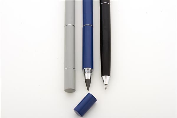 Metalowy długopis 2w1 z jednej strony posiadający przekręcaną tradycyjną końcówkę a z drugiej bezatramentową. W czarnym pudełku upominkowym. Z niebieskim wkładem i końcówką ze stopu metalu, który utlenia papier.