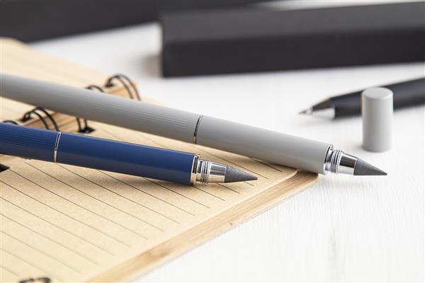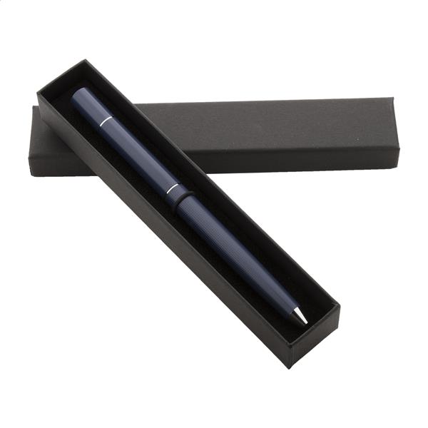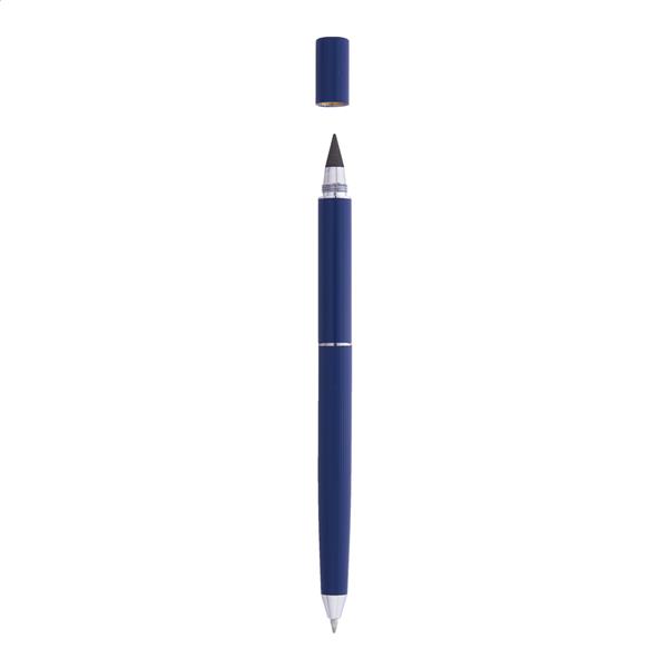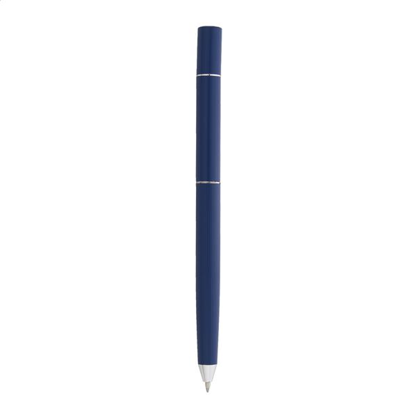 Metalowy długopis 2w1 z jednej strony posiadający przekręcaną tradycyjną końcówkę a z drugiej bezatramentową. W czarnym pudełku upominkowym. Z niebieskim wkładem i końcówką ze stopu metalu, który utlenia papier.