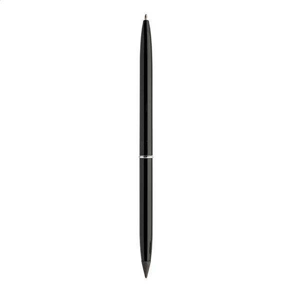 Przekręcany długopis 2w1 z aluminium z recyklingu z ołówkiem wiecznym. Z niebieskim wkładem i końcówką ze stopu metalu, która utlenia papier. Ten długopis pisze podobnie do ołówka, a także jest usuwalny.
