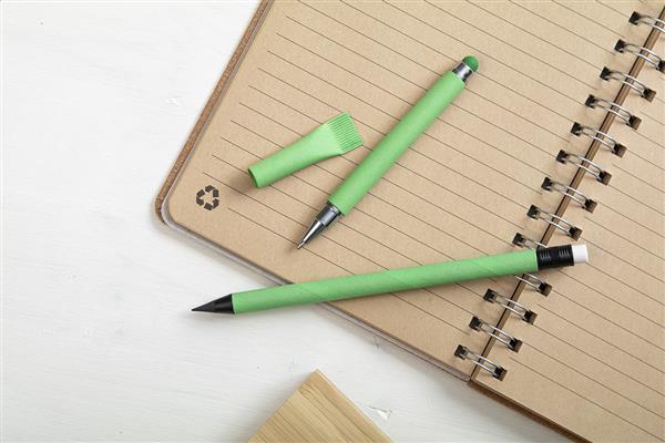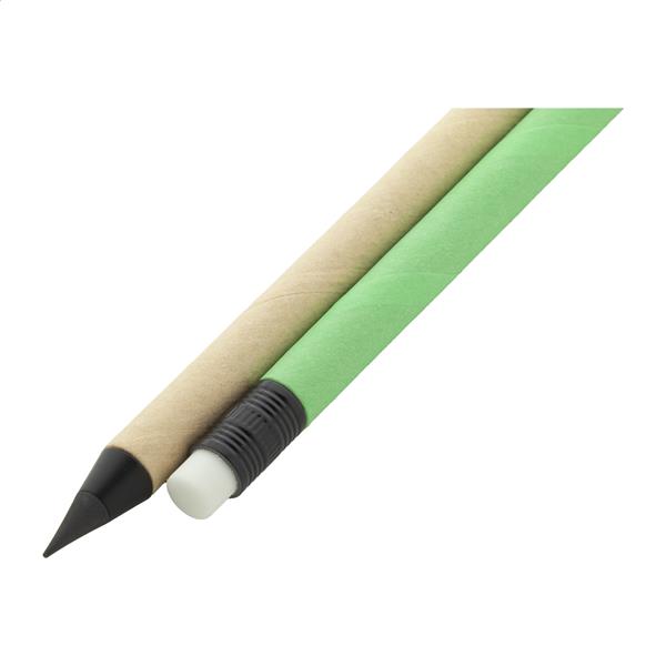 Długopis bezatramentowy z papieru z recyklingu z czarnymi elementami i gumką. Z końcówką ze stopu metalu, która utlenia papier. Ten długopis pisze podobnie do ołówka, a także można go wymazać.