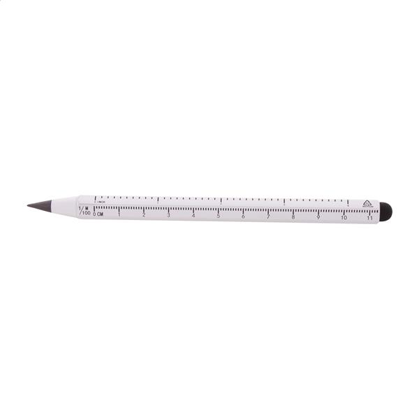 Bezatramentowy długopis z aluminium pochodzącego z recyklingu z końcówką do ekranów dotykowych i końcówką piszącą ze stopu metalu, który utlenia papier. Z sześciokątnym korpusem zawierającym linijki 11 cm i 4 cale. Ten długopis pisze podobnie do ołówka, a także można go wymazywać.