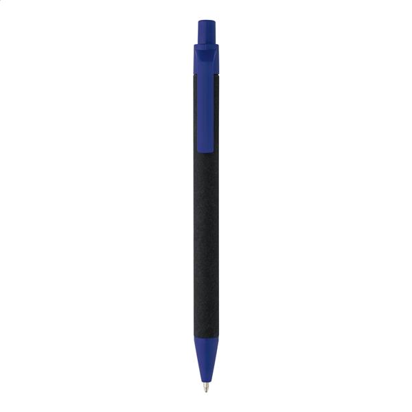 Długopis z papieru z recyklingu, z czarnym korpusem i elementami z recyklingowanego ABS. Z niebieskim wkładem.