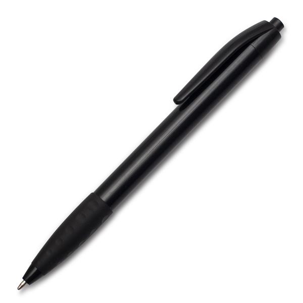 Plastikowy długopis promocyjny z gumowym uchwytem. Wkład w kolorze niebieskim.