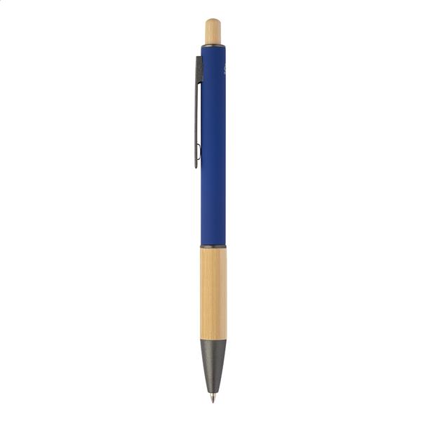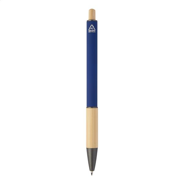 Długopis z aluminium pochodzącego z recyklingu z uchwytem i przyciskiem z bambusa, gumowanym korpusem i elementami z brązu. Z niebieskim wkładem.