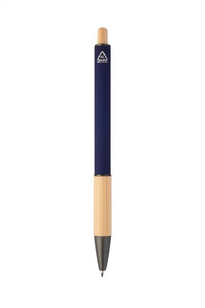 Długopis z aluminium pochodzącego z recyklingu z uchwytem i przyciskiem z bambusa, gumowanym korpusem i elementami z brązu. Z niebieskim wkładem.