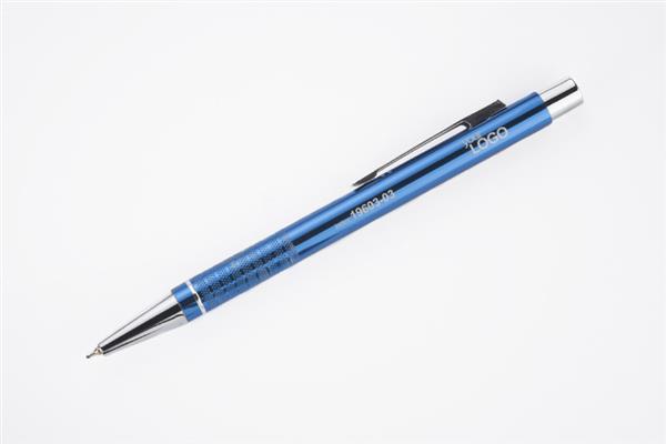 Długopis BONITO to klasyczny elegancki długopis metalowy o metalicznych kolorach z chromowanymi wykończeniami. Wykonany z aluminium. Korpus ozdobiony srebrnym ringiem na dole oraz paskami o delikatnie chropowatej strukturze. Nowy typ wkładu z tuszem półżelowym o grubości pisania 0,7 mm. Wkład w kolorze niebieskim.