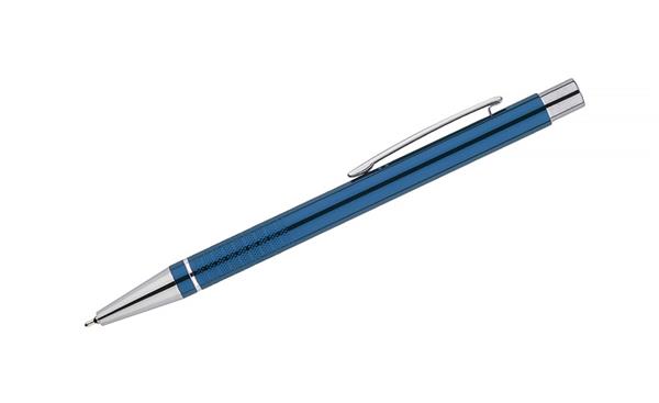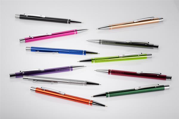 Długopis BONITO to elegancki metalowy długopis w metalicznych kolorach z chromowanymi wykończeniami. Wykonany z wysokiej jakości aluminium, korpus długopisu ozdobiony jest srebrnym ringiem oraz paskami o delikatnie chropowatej strukturze. Długopis wyposażony jest w wkład z tuszem półżelowym w kolorze czarnym o grubości 0,7 mm.