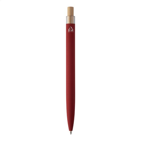 Długopis z aluminium pochodzącego z recyklingu z gumowanym wykończeniem, bambusowym włącznikiem i chromowanym klipem. Ze specjalną powłoką pod grawer lustrzany. Z niebieskim wkładem.