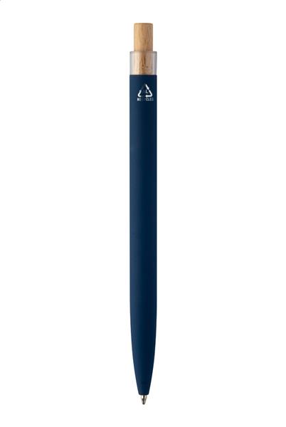 Długopis z aluminium pochodzącego z recyklingu z gumowanym wykończeniem, bambusowym włącznikiem i chromowanym klipem. Ze specjalną powłoką pod grawer lustrzany. Z niebieskim wkładem.
