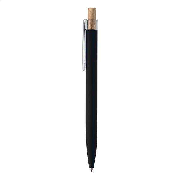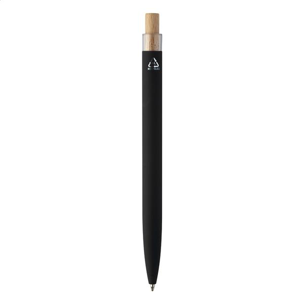 Długopis z aluminium pochodzącego z recyklingu z gumowanym wykończeniem, bambusowym włącznikiem i chromowanym klipem. Ze specjalną powłoką pod grawer lustrzany. Z niebieskim wkładem.