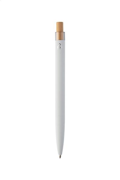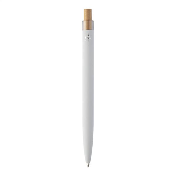 Długopis z aluminium pochodzącego z recyklingu z gumowanym wykończeniem, bambusowym włącznikiem i chromowanym klipem. Ze specjalną powłoką pod grawer lustrzany. Z niebieskim wkładem.