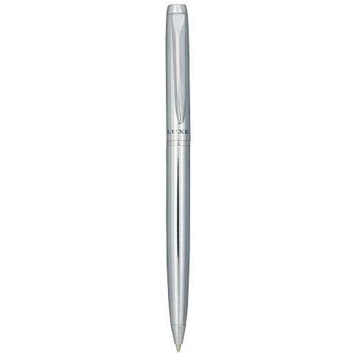 Ekskluzywnie zaprojektowany długopis z błyszczącymi, chromowanymi akcentami. W zestawie wysokiej jakości wkład z czarnym tuszem, zapakowany w pudełko prezentowe „LUXE” (15 x 3,5 x 2 cm).