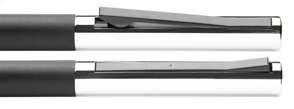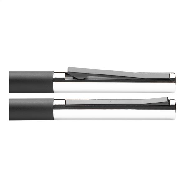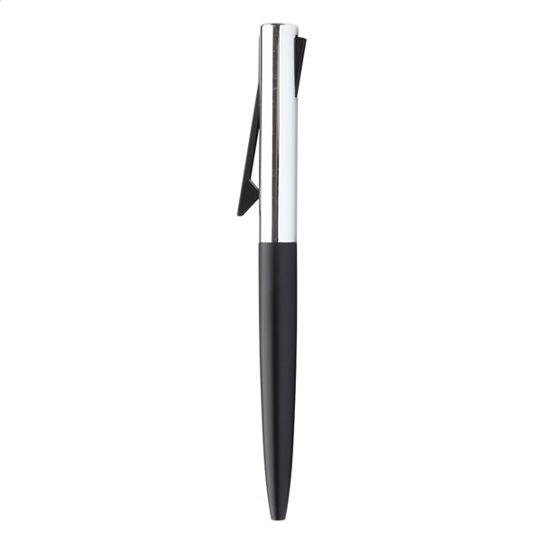 Aluminiowy długopis ze specjalnym ruchem klipa. W pasującym metalowym etui. Z niebieskim wkładem.