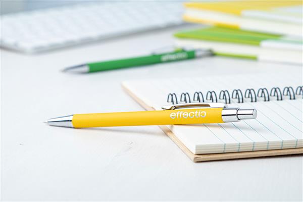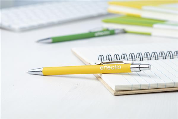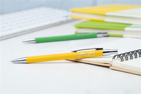 Aluminiowy długopis z gumowanym wykończeniem i niebieskim wkładem. Ze specjalną powłoką pod grawer lustrzany.